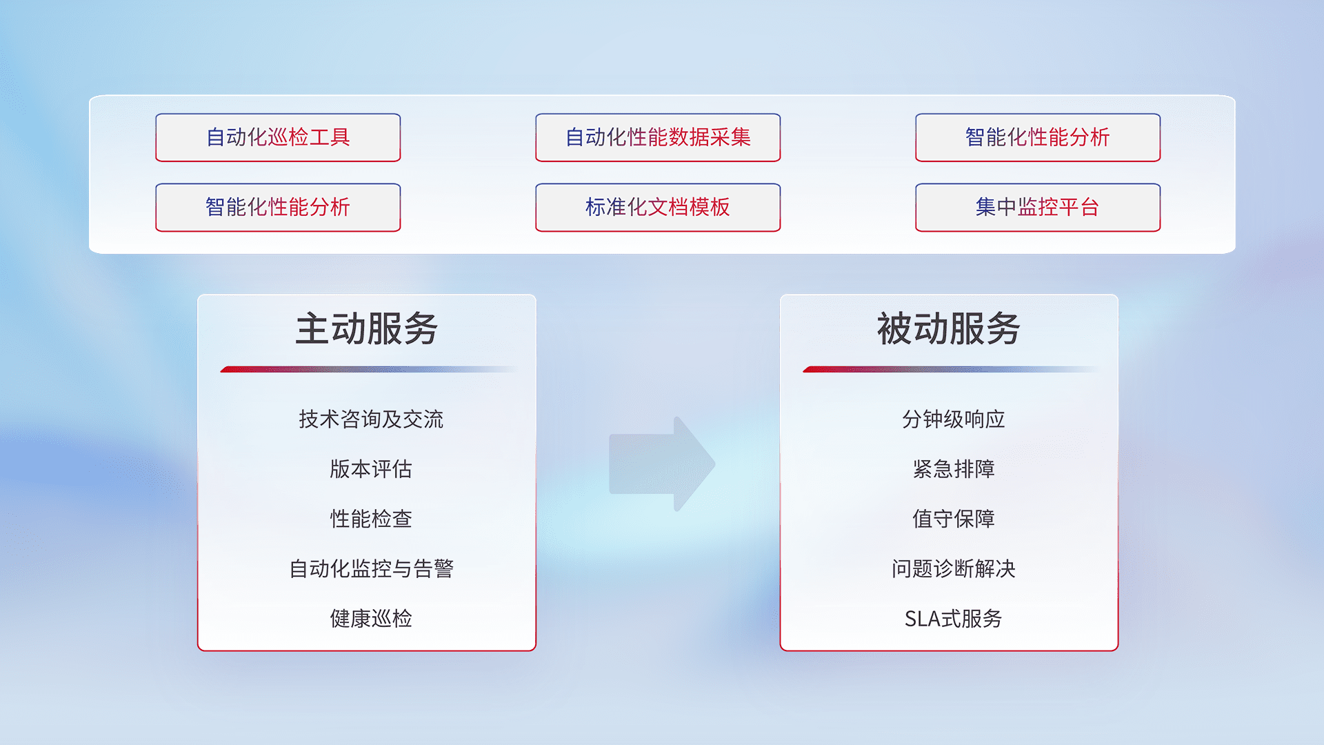 智能化工具和标准化文档,,,保障服务质量,,,提供主动服务(包含技术咨询、、、、版本评估、、、、性能检查、、自动化监控与告警、、、健康巡检)和被动服务包含(分钟级响应、、紧急排障、、、、值守保障、、、问题诊断解决、、SLA服务)。。。。