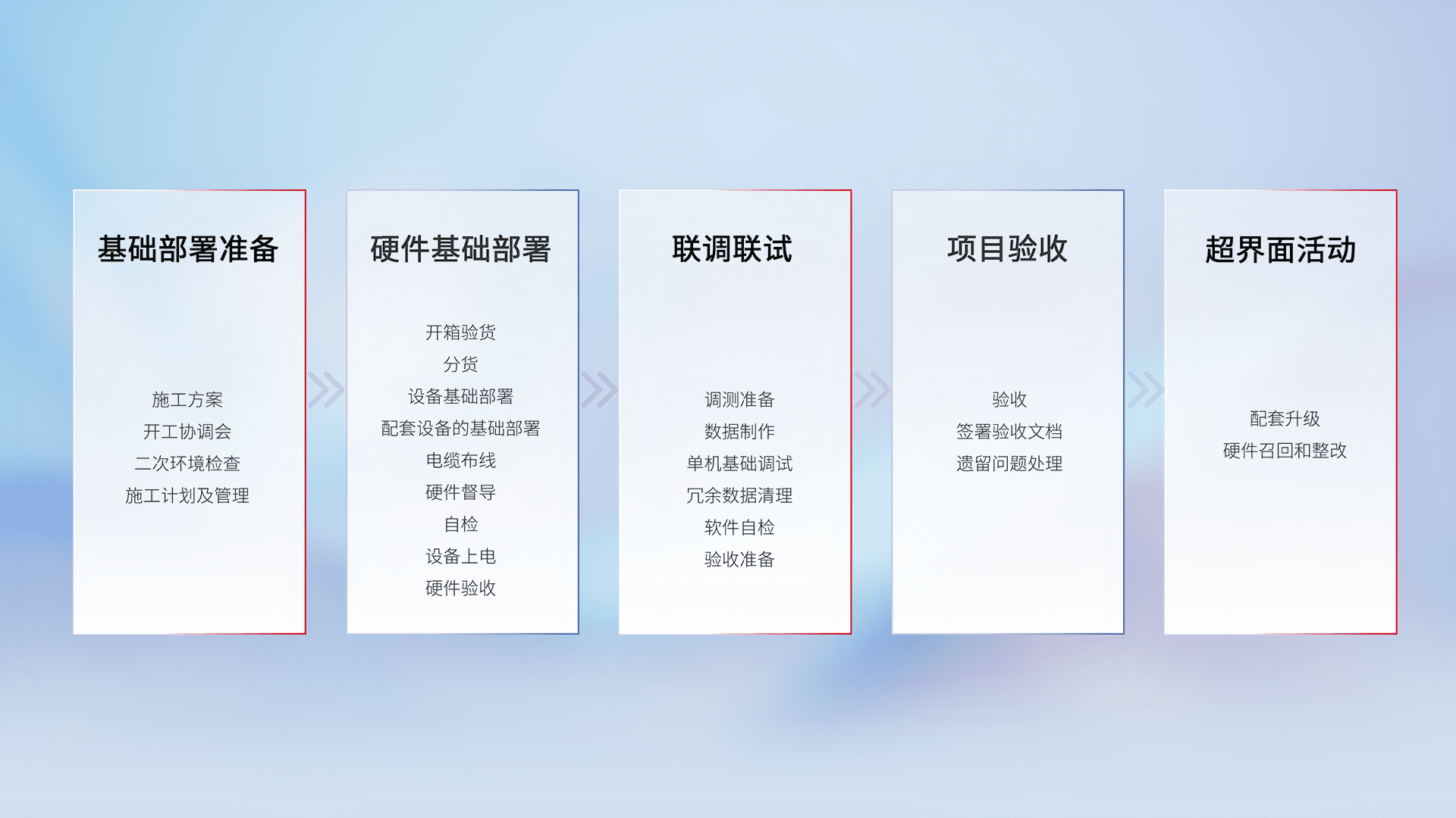 从基础部署准备、、、硬件基础部署、、、、联调联试、、、项目验收、、、越界面活动的全过程可追溯,,,,保证施工质量和进度。。
